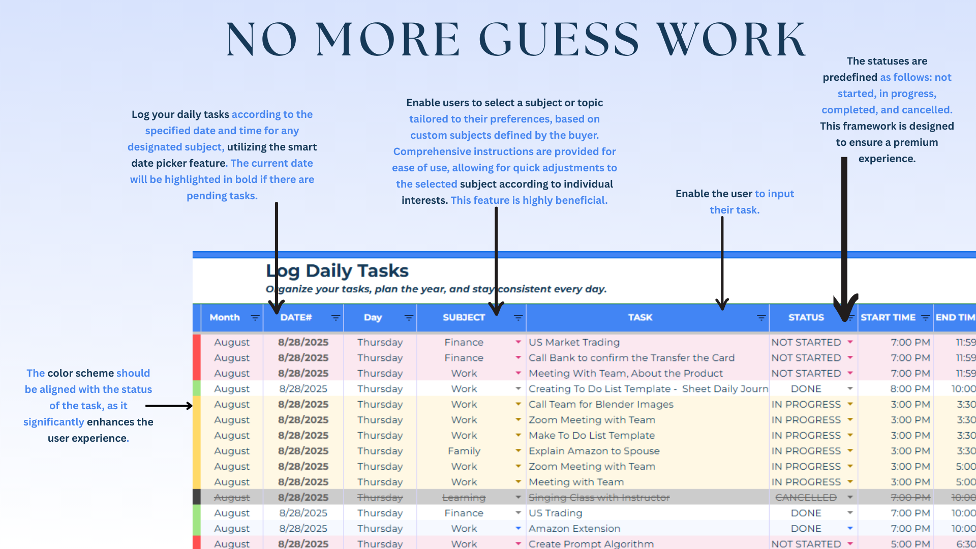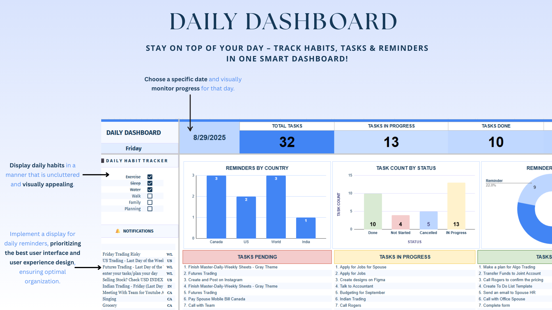 Buy NowDaily Task tracker enables the addition of tasks by date and status, subject to change unlike fixed reminders. Your tasks are unique and may or may not rely on reminders. Consider a separate sheet for enhanced User experience.