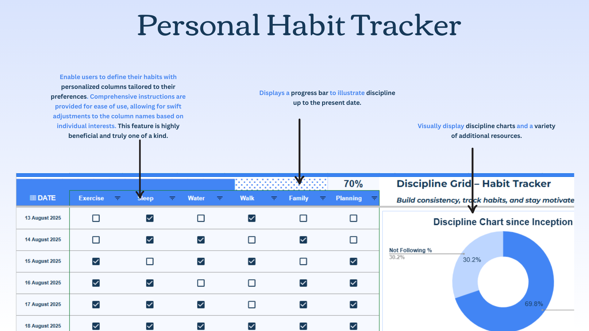 Buy NowHabit Tracker enables you to maintain discipline. Establish fixed habits that are not tasks, but routines you wish to follow regularly. It demonstrates your overall discipline on a weekly basis, indicating what you are adhering to and what you are not. A remarkable method to monitor your habits daily.