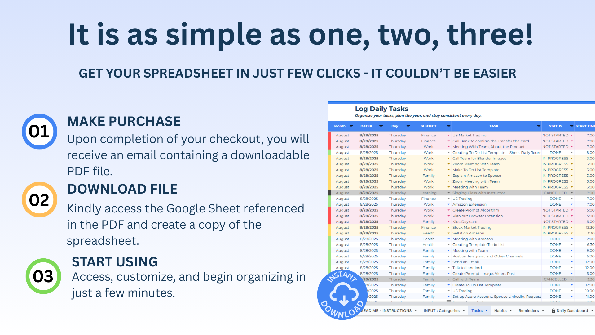 Buy NowIt is as simple as one, two, three. Get your spreadsheet in just few clciks, it couldnè;t be easier. Make purchase, Download PDF file which has link to google sheet. Make a copy of it and start using. This streamlined process ensures you can have your spreadsheet ready in no time. Simply make your purchase, download the PDF file containing the Google Sheet link, make a copy, and get started.
