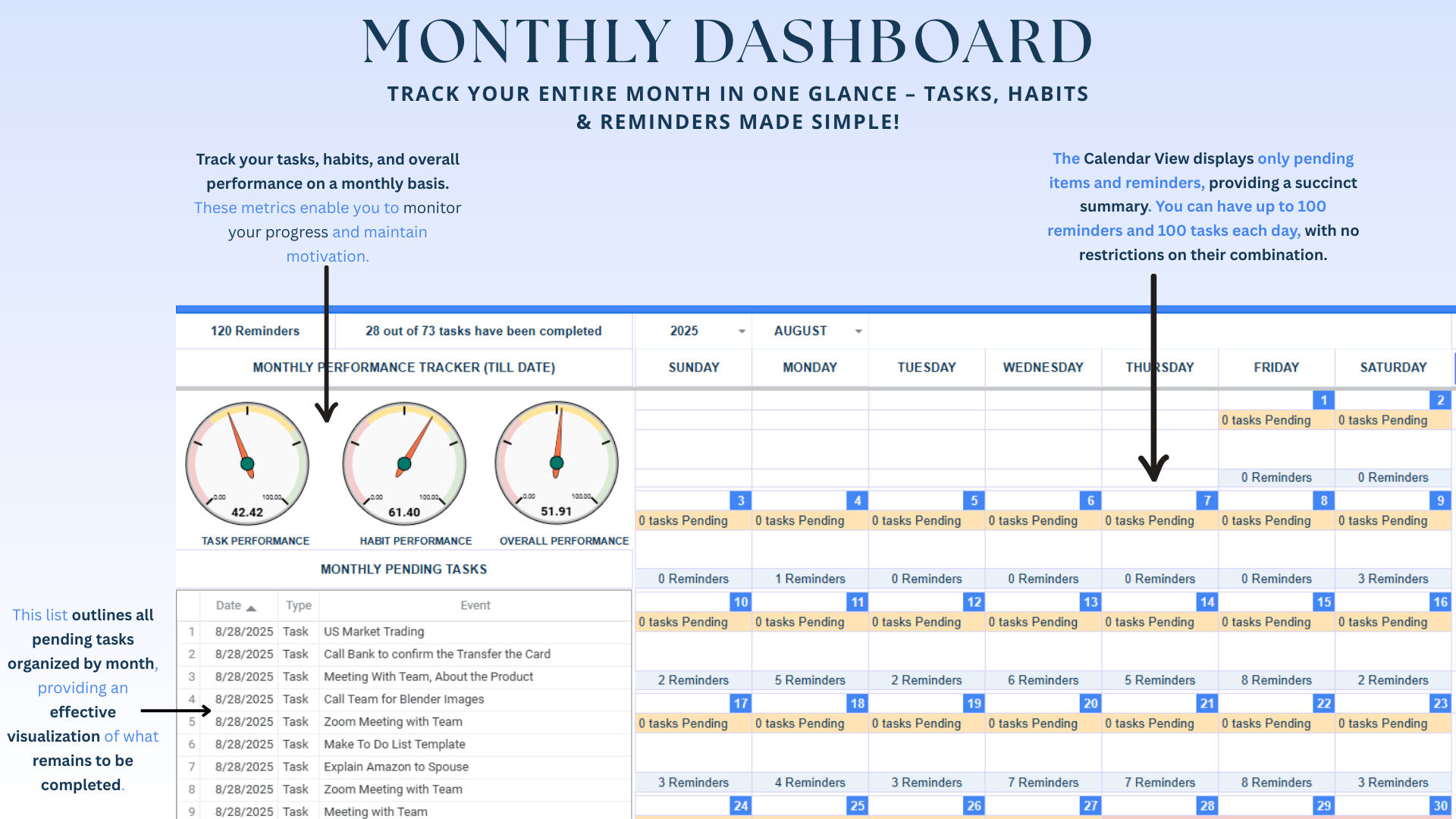 Buy NowThe Monthly dashboard displays tasks, reminders, and performance metrics for the entire month, including pending tasks, completion rates, habit tracking, and overall progress. It offers a precise overview of your monthly performance, promoting discipline and motivation.