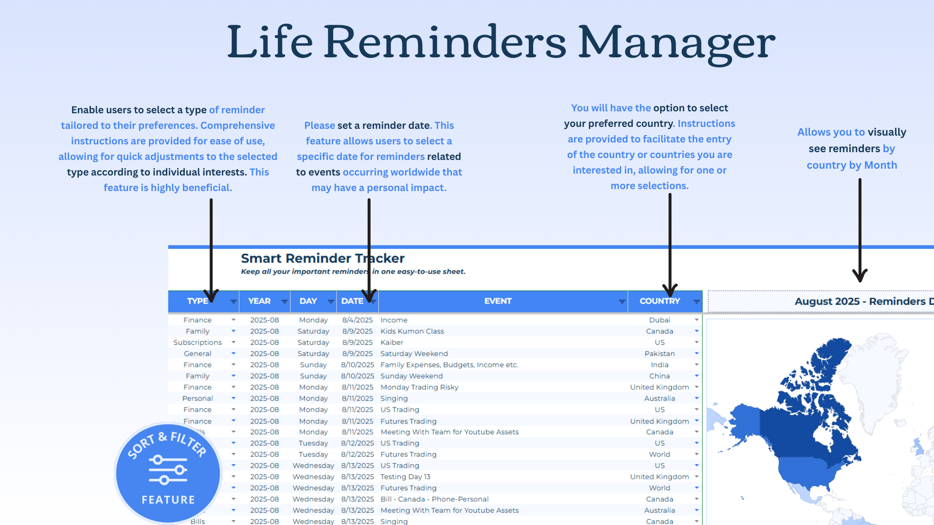 Buy NowThe Reminder Sheet is crafted to facilitate the management of crucial dates, deadlines, and events effortlessly. Incorporating stock market expiration days, tax deadlines, birthdays, anniversaries, and personal commitments, this sheet ensures your schedule is always well-maintained.