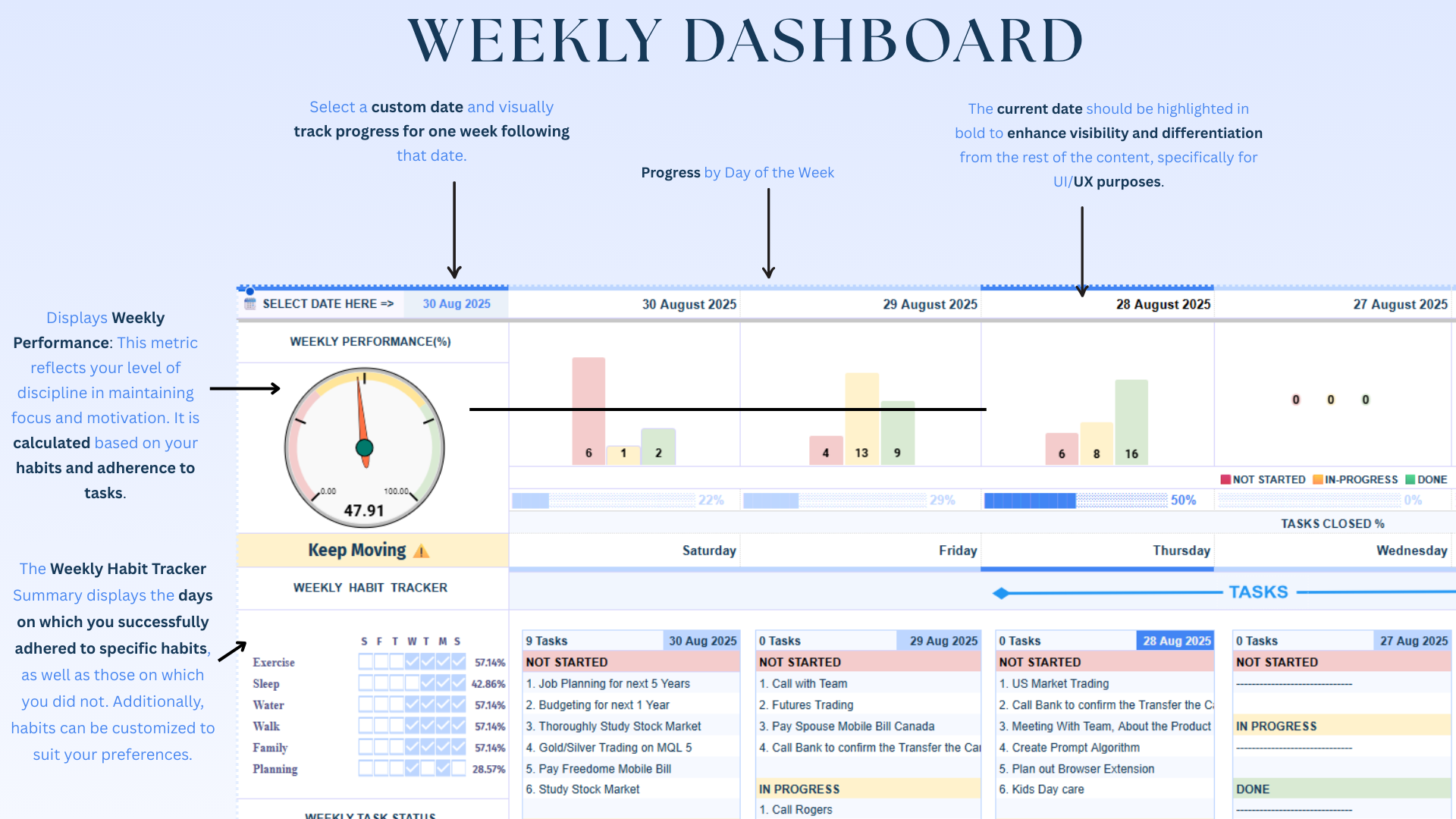 Buy NowWeekly dashboard enables tracking of all habits weekly, assesses performance this week or any other based on selected date, displays daily task progress, habits enhances user experience